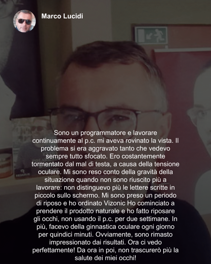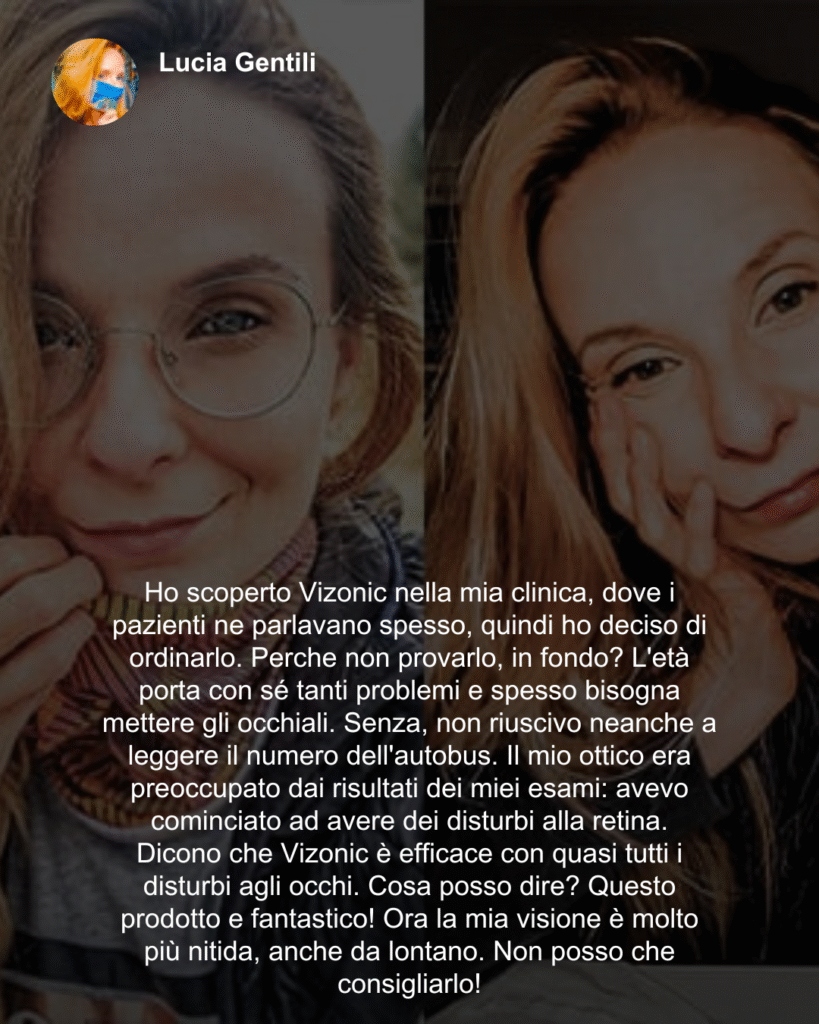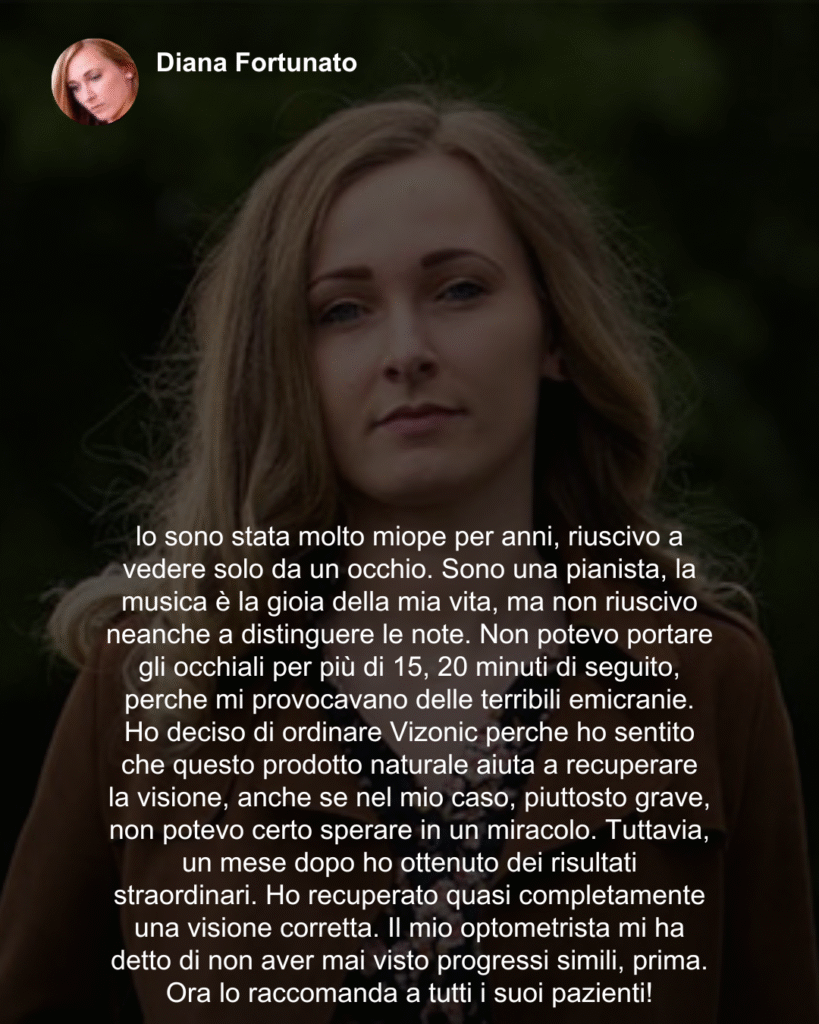 Negli ultimi anni, il numero di persone affette da perdita della visione è aumentato di 18 volte. Molti dei miei pazienti vanno nel panico e mi chiedono di prescrivergli lenti e occhiali, pur non capendo che questo tipo di misure non fa che peggiorare la situazione, facendo ammalare ancora di più l'occhio. Oggi è possibile risolvere il problema con un prodotto naturale. Vizonic è stato creato appositamente. lo lo consiglio a tutti i miei pazienti. E nel 99% dei casi, un solo ciclo di trattamento e sufficiente per ridare loro una visione chiara e perfetta. Questo prodotto contiene una miscela di ingredienti unici, che ripristina la funzionalità dei muscoli oculari e migliora le condizioni del cristallino, le condizioni principali per ritrovare una buona visione. In associazione a degli esercizi mirati per gli occhi, questo trattamento assicura dei risultati positivi nei tempi più brevi possibili e aiuta a evitare l'intervento chirurgico.